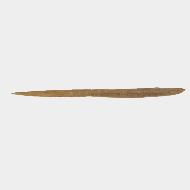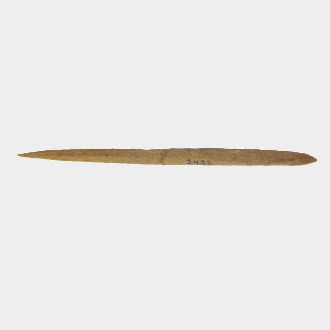 Objeto de uso doméstico alargado de perfil recto y sección plano convexa, con ambos exremos aguzados. Se presenta pulido. Elaborado sobre un hueso de mamífero terrestre.