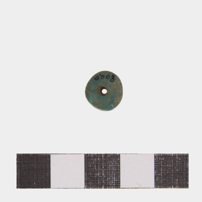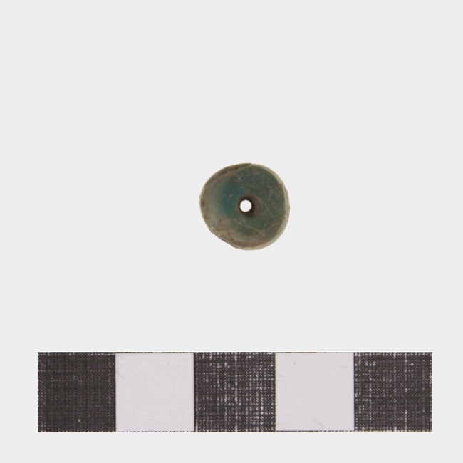 Objeto ornamental de uso personal de forma subdiscoidal, sección plana y una perforación central bicónica. Elaborado en malaquita. Cuenta para pender en collar.