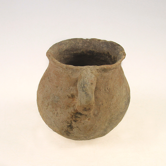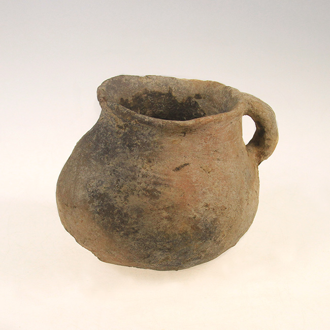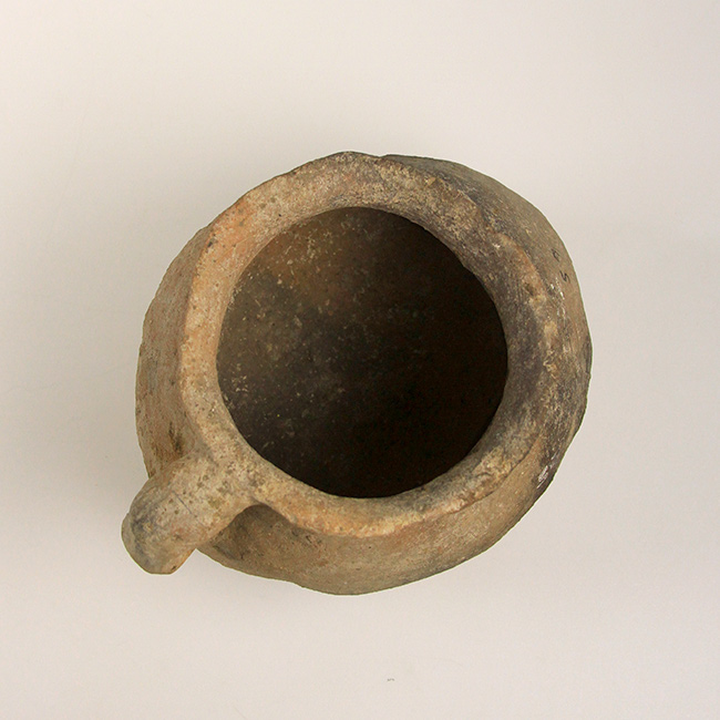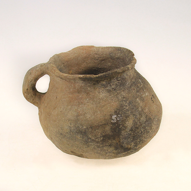 Contenedor de uso ritual y/o doméstico asimétrico, de estructura restringida con cuello y perfil inflectado. Corresponde a una vasija o jarro zapato de cuerpo elipsoidal y cuello hiperboloide, con un asa vertical labioadherida, borde evertido y base convexa. Presenta hollín producto de la exposición al fuego.