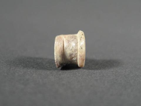Objeto ornamental de uso personal de forma cilíndrica corta y sección circular, elaborado en combarbalita de color gris con vetas de color negro. Presenta dos apéndices de sujección laterales para permitir adherencia al labio inferior. En la literatura del área, este tipo de adorno ha sido definido como “Tembetá de botón".