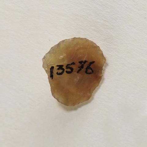 Objeto de uso doméstico de talla bifacial de forma subcircular y sección plano-convexa. Se encuentra elaborado sobre lasca de calcedonia traslúcida de color café. Presenta borde activo de forma convexo.
