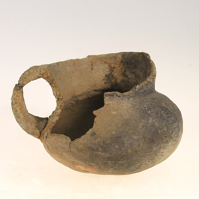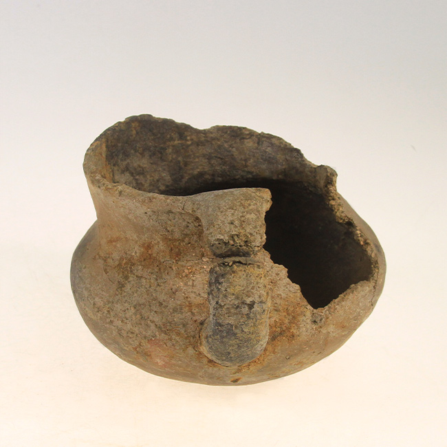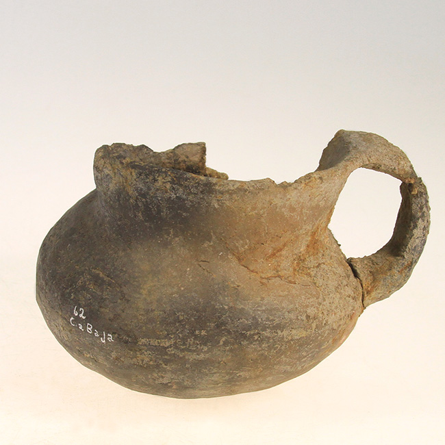 Contenedor de uso ritual y/o doméstico asimétrico, de estructura restringida con cuello y perfil inflectado. Corresponde a una vasija o jarro zapato de cuerpo elipsoidal y cuello hiperboloide, con un asa vertical labioadherida, borde evertido y base convexa. Presenta hollín producto de la exposición al fuego.