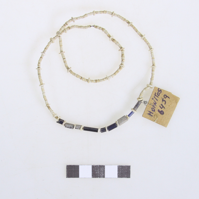 Objeto ornamental de uso personal. Se encuentra conformado por numerosas cuentas de material malacológico color blanco y otras líticas grises y negras. Las cuentas malacológicas son de forma discoidal en dos tamaños, mientras que las líticas son de morfología tubular o cilíndrica.