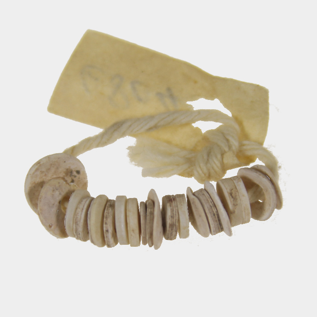 Objeto ornamental de uso personal, collar o conjunto de cuentas de collar, conformado por 21 cuentas malacológicas de forma discoidal, con agujero central bicónico.