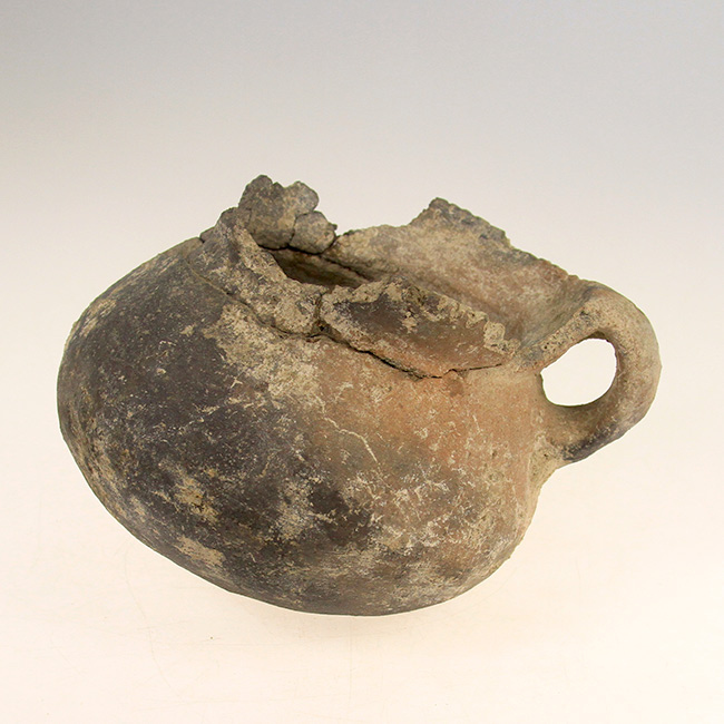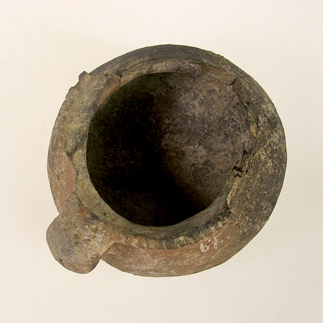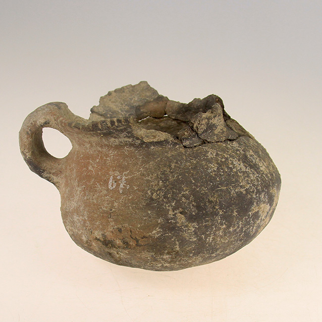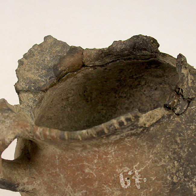 Contenedor de uso doméstico y/o ritual asimétrico, de estructura restringida con cuello y perfil compuesto. Corresponde a una vasija o jarro zapato de cuerpo ovoide, cuello cónico, borde directo evertido y base convexa. Tiene un asa labioadherida en el sector posterior y huellas de hollín por exposición al fuego. Además, presenta labio decorado con incisiones verticales paralelas.