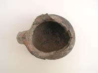 Asimétrico (tipo zapato según formato y la denominación universal conocida para este cerámio). Color de fondo natural (beige), decoración excisa o sobre relieve a nivel del labio - borde, huellas de hollín a nivel frontal del cuerpo, por su postura al fuego (función/uso).