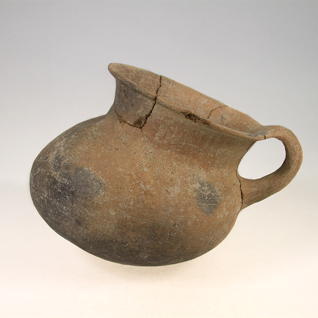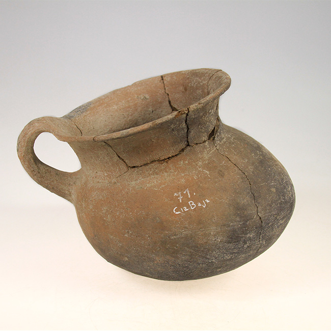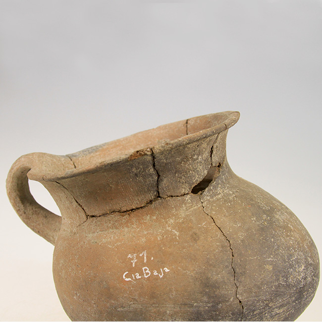 Contenedor de uso doméstico y/o ritual asimétrico, de estructura restringida con cuello y perfil compuesto. Corresponde a una vasija o jarro zapato de cuerpo ovoide, cuello cónico, borde directo evertido y base convexa. Tiene un asa labioadherida vertical. Su superficie es monocroma y alisada, con huellas de hollín por exposición al fuego.
