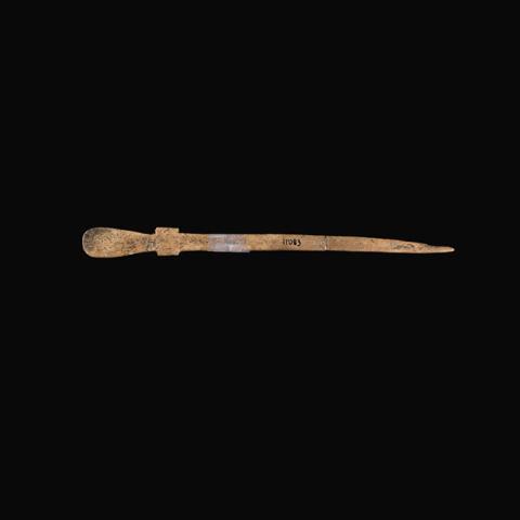 Objeto de uso doméstico de perfil ligeramente curvo y sección plana, cuyo extremo proximal corresponde a una paleta cóncava, mientras que el extremo distal se presenta fracturado. En el sector medial tiene dos apéndices cuadrangulares sobresalientes. Hueso largo de mamífero terrestre.