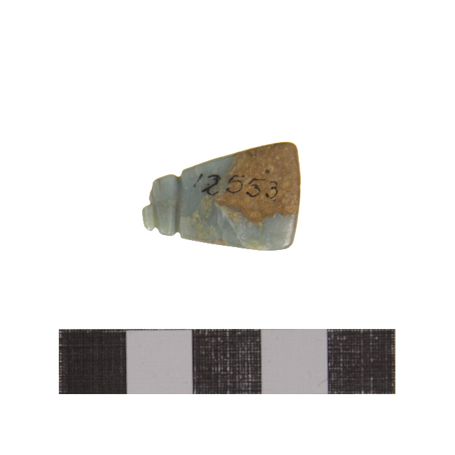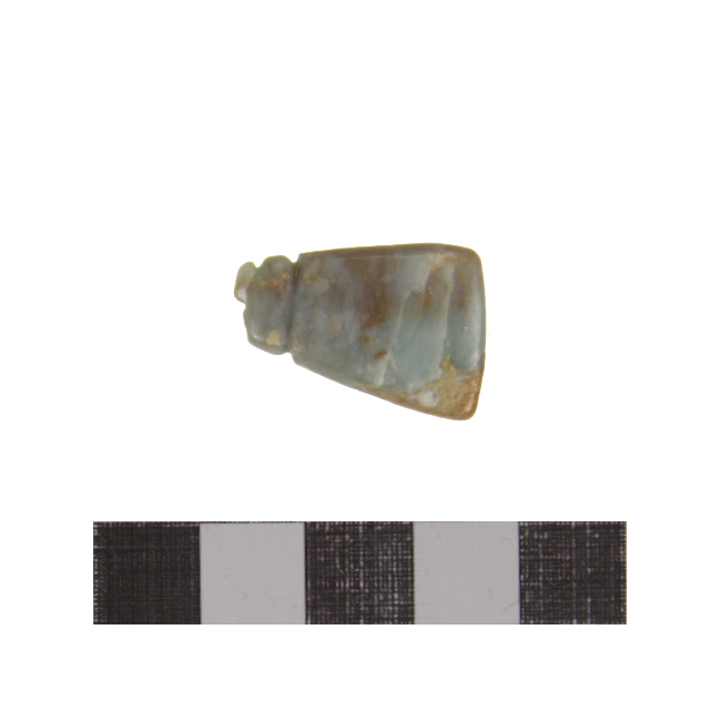 Objeto personal de uso decorativo, o pendiente de collar/colgante, de forma triangular con surcos horizontales paralelos para el amarre. Está elaborado en malaquita.