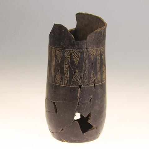 Pieza simétrica; perfil inflectado; cuerpo cilíndrico levemente tronco cónico; ausencia de borde y labios; base circular plana; tratamiento de superficie pulido; banda decorativa geométrica grabada incisa con líneas y triángulos en la parte media externa del cuerpo; de color negro.