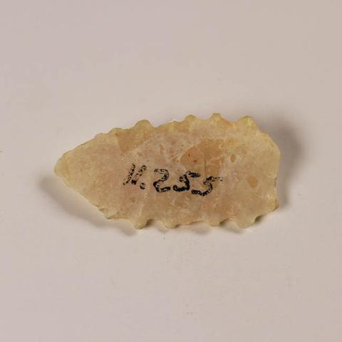 Objeto de uso doméstico de talla bifacial de forma lanceolada apedunculada, de base recta. Elaborado en piedra blanca amarillenta. Presenta bordes serrados.