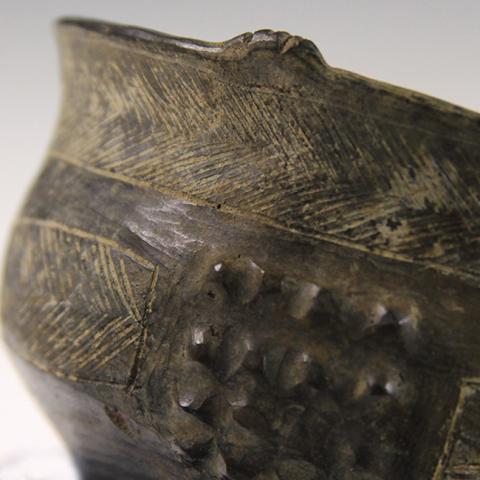 Vasija de forma abierta, en donde su altura es 1.7 veces menor que el diámetro de su boca. Por su silueta o cuerpo (contorno) de apariencia compuesta, con superficie externa negra-grisácea brillante (pulido) y decoración grabada incisa, en sobre relieve con 16 protuberancias. Interior (liso) sin decoración y en similar coloración a su exterior. Base y fondo de la vasija convexo.