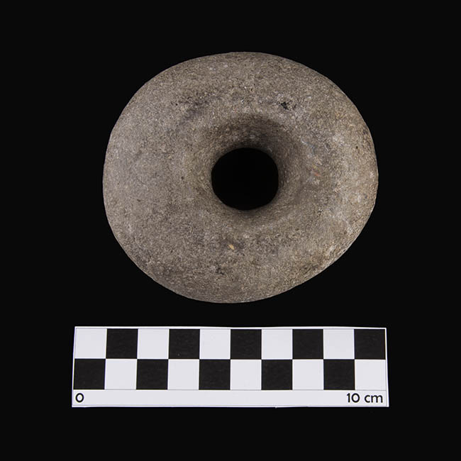 Objeto de uso doméstico y/o ritual de función desconocida. Presenta forma ovoide y se encuentra elaborado sobre un guijarro de andesita. Posee una horadación central bicónica de bordes alisados.