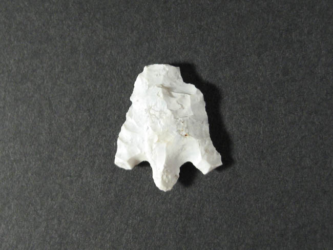 Objeto de uso doméstico de talla bifacial de forma triangular pedunculada, de base pedunculo convergente con aletas y sección biconvexa. Elaborado en materia prima de color blanco.