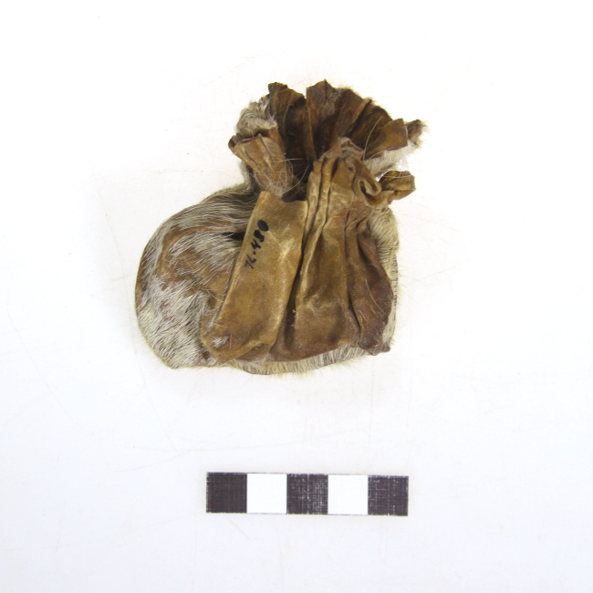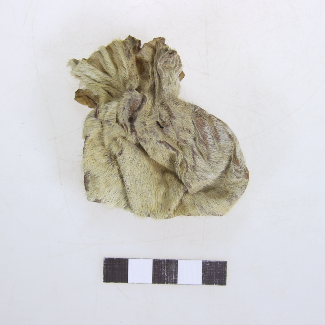 Contenedor de uso doméstico o ritual de cuero, correspondiente a una pequeña bolsa con acinturamiento en el sector superior para la amarra. Elaborada a partir un único fragmento de cuero de animal, con pelaje de color blanco.