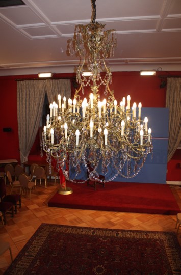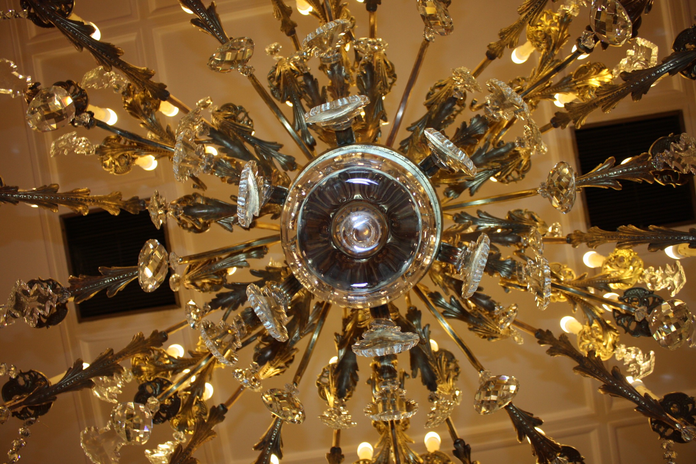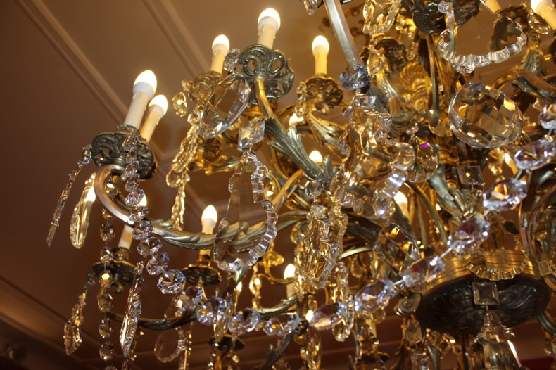 Lámpara de araña de cincuenta y dos luces, con estructura de bronce dorado y ornamentación en cristal. Artefacto de iluminación diseñado para ser colgado desde un techo o cielo raso. Las luces están estructuradas en cuatro pisos. Los brazos de bronce cincelado tienen formas vegetales similares a hojas de acanto. Entre las cuentas de cristal que componen la decoración es posible identificar plaquetas, lanzas, rosarios, rombos, prismas y almendrillas. Estas piezas están unidas y ancladas a la estructura de bronce mediante alambres de alpaca. Una gran esfera de cristal, ubicada al centro, abajo, decora y remata la lámpara.