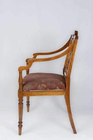 Mueble de asiento compuesto por una estructura de madera. Tiene respaldo rectangular con marco de madera calada, sin tapizar, en cuyo barrote superior tiene una forma convexa, semicircular. Los brazos son curvos, con un detalle cóncavo para apoyar las manos. El asiento es recto, acolchado y tapizado con tapiz gobelino color rojo con detalles fitomorfos y zoomorfos, destacando la figura de caninos y cérvidos. Tiene un friso liso. Las patas son de forma cónica, torneadas con anillos.