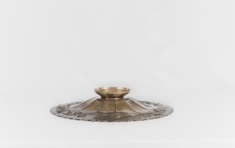 Recipiente, hecho en metal, para poner frutas, de volumen cóncavo, base circular, color plateado y decorado con relieves. La cara interna de la parte cóncava tiene forma de flor y el borde está decorado con motivos fitomorfos de hojas y flores.