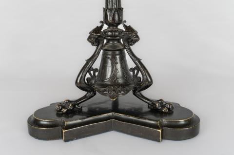 Candelabro de tres brazos elaborado en bronce fundido y patinado en color negro. Sobre la base, sosteniendo el fuste, se aprecian tres grifos. Los brazos están conectados por tres cadenas que decoran la pieza.