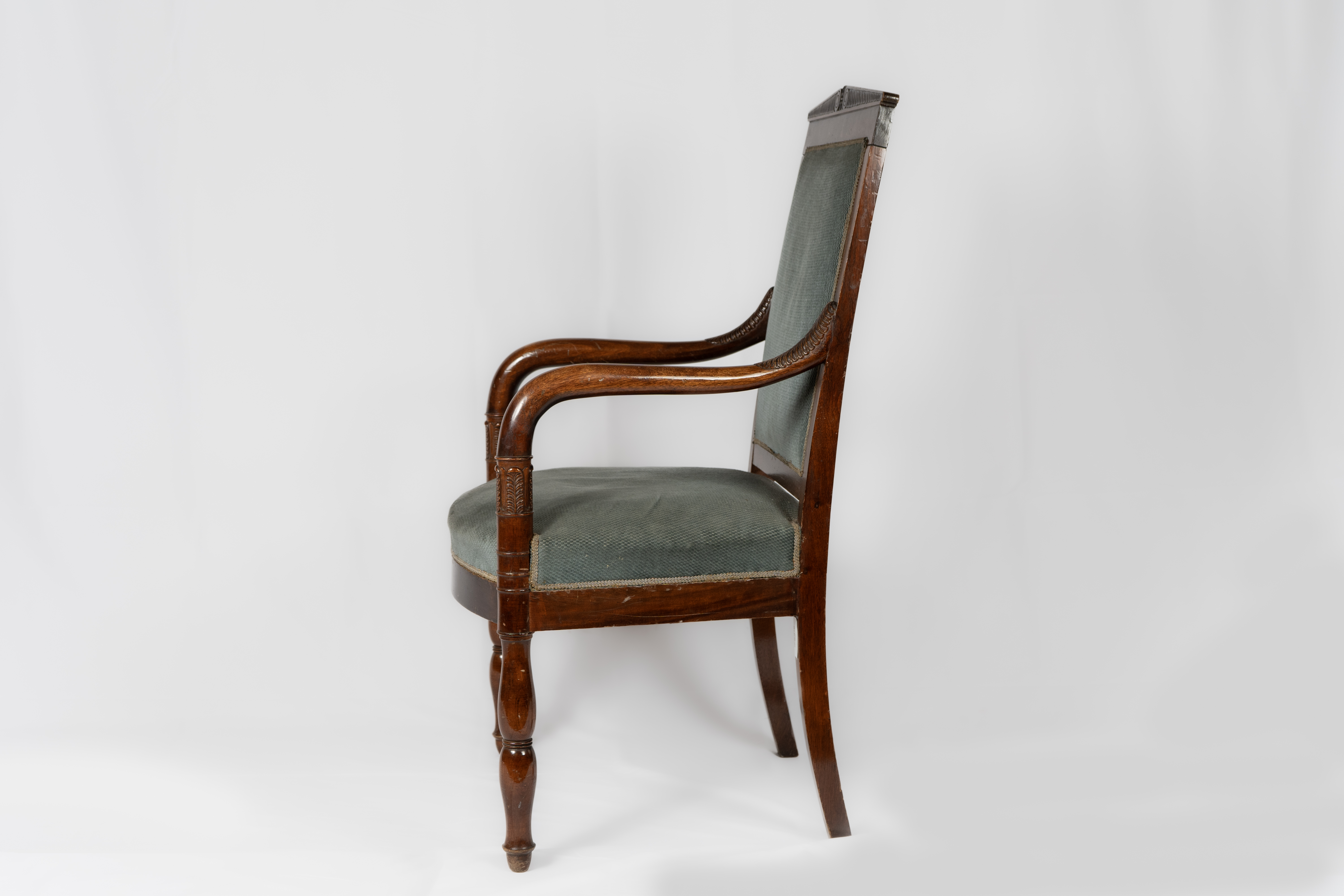 Mueble de asiento compuesto por una estructura de madera. El respaldo es rectangular y está tapizado, con un marco de madera tallado en la parte superior con roleos centrados. El asiento es recto, acolchado y tapizado. Los brazos son curvos y presentan terminaciones decoradas con motivos fitomorfos. Las patas delanteras son torneadas con detalles de anillos, mientras que las patas traseras son curvas, con sección rectangular. Tanto el respaldo como el asiento están tapizados en felpa de color turquesa oscuro.