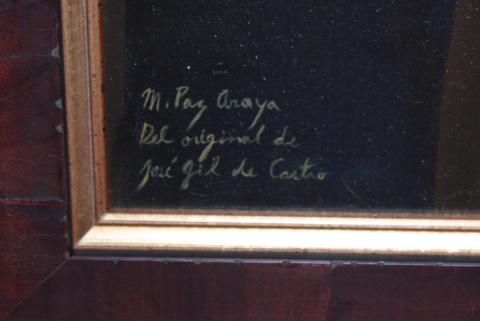 En la esquina inferior izquierda lleva escrito en amarillo: “M. Paz Araya Del original de José Gil de Castro”.
