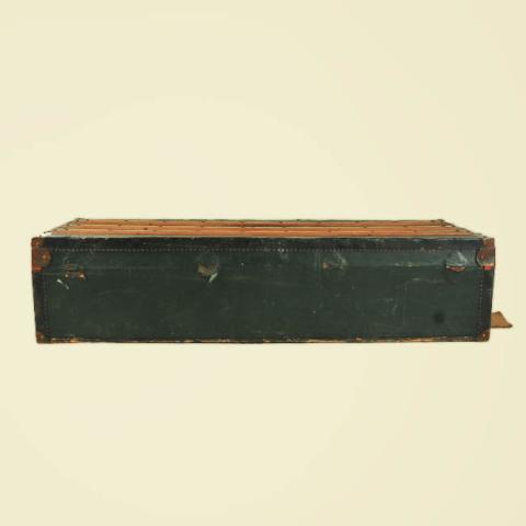 Maleta con la etiqueta de Pavillon de Rohan, Paris. Éste era un edificio donde se fabricaba vestimenta de caballeros. Probablemente perteneza al embalaje original de las prendas textiles de dicha marca, de la colección perteneciente al Museo Benjamín Vicuña Mackena.