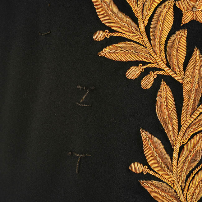 Prenda de vestir para la parte superior del cuerpo de uso masculino, de color azul marino. Bordado en hilos metálicos dorados con motivos de ramas de laureles y hojas, y botones.