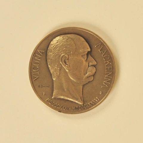 Pieza de bronce, de forma circular. El anverso presenta una figura masculina en relieve, de busto y perfil, semi calvo, lleva bigote grueso. En el campo se lee "Vicuña Mackenna" y numeración romana "MDCCCXXXI- MDCCCLXXXVI". En el reverso se lee "República de Chile. Museo Nacional Vicuña Mackenna. Inaugurado en 1957" y en el campo, el Escudo Nacional de Chile.