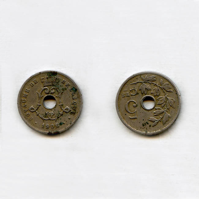 Objeto de forma circular de metal. Moneda con perforación en centro, Corona en zona superior, en bordes inscripción "Royaume de Belgique". Reverso con elementos fitomorfos e inscripción "5 Ces."