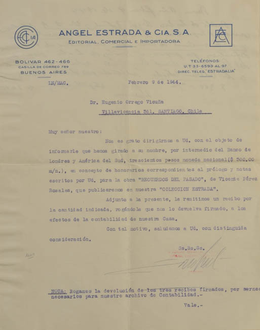Carta del señor gerente de Angel Estrada & Cía S.A. a don Eugenio Orrego Vicuña