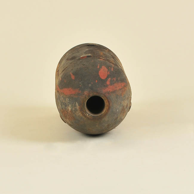 Objeto de munición realizada en metal. La zona superior es de forma troncocónica de punta plana. Su cuerpo es liso y presenta tres líneas con bandas, su base es plana.