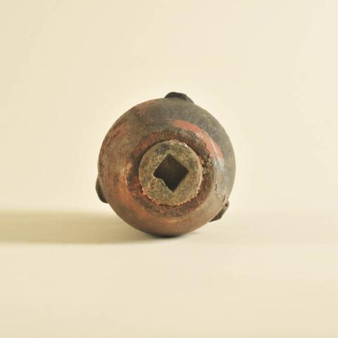 Objeto de munición realizado en metal. La zona superior es de forma troncocónica de punta plana. Tiene tres zonas con dos bandas circulares.