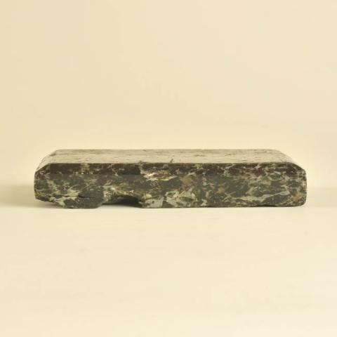 Objeto de formato rectangular en mármol veteado de color verde y blanca, se observan sus bordes redondeados y su superficie pulida.