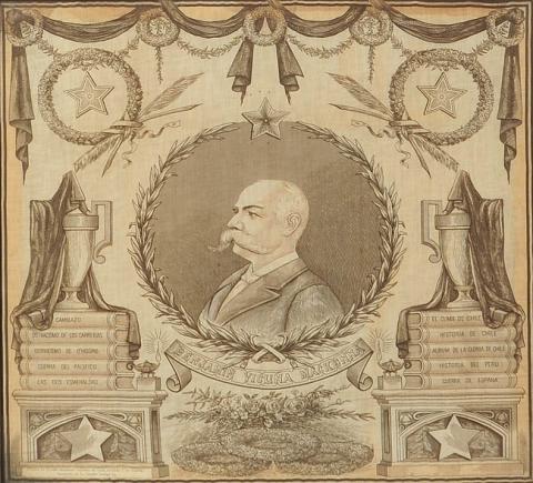 Este pañuelo fue impreso en serie con ocasión de la muerte de Benjamín Vicuña Mackenna, el 25 de enero de 1886.