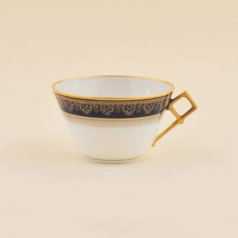 Conjunto usado para beber té, compuesto por dos objetos, un contenedor de forma troncocónica de color blanco con el borde superior de color azul oscuro con decoración vegetal dorada. Tiene un asa de forma rectangular dorada. Al centro del objeto tiene un monograma también de color dorado. El segundo objeto corresponde a un plato de forma circular de con una depresión circular, para ubicar la taza, enmarcada por una línea dorada. El borde está decorado con una franja de color azul con diseños vegetales dorados.