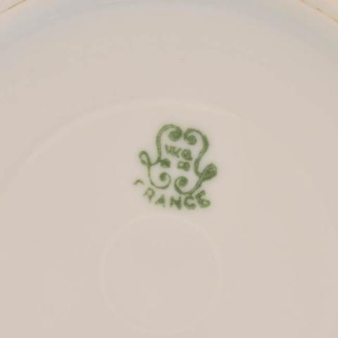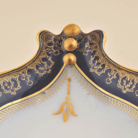Recipiente para contener mantequilla, realizado en porcelana de color blanco con guarda azul, decoración de vegetales en dorado. Se observa un monograma VSV dorado.