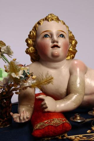 Figura infantil de bulto y talla completa, torso desnudo en posición yacente, lleva el cabello dorado rizado con resplandor de color plateado. Brazo derecho flectado apoyado en una almohada de color rojo con bordes dorados, el brazo izquierdo doblado hacia adelante. Piernas juntas rematan en pies descalzos. La figura viste un calzón blanco bordado. En la base se ubica un candelabro de metal con cinco cavidades y espigas secas en un jarrón de flores de colores. El conjunto de apoya sobre una base de forma ovalada con cuatro patas de madera barnizada, cubierta por una cúpula de vidrio, liso y transparente de forma cóncava que en la parte inferior presenta una abertura que se ajusta al calado de la base.