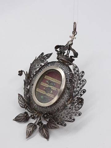 Contenedor ovalado tipo caja con marco de filigrana metálico. Cubierta de vidrio, con argolla en el extremo superior.