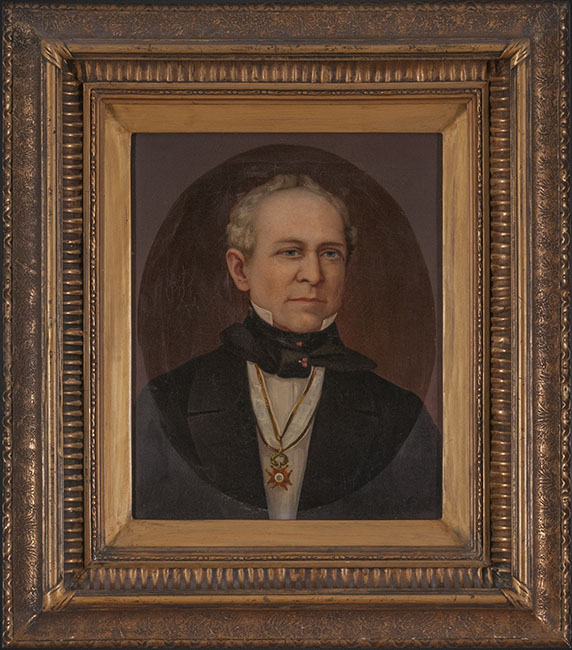 Obra de formato rectangular en orientación vertical. Pintura que representa un retrato masculino ovalado. Se observa un hombre, adulto, de pelo corto, canoso, ojos claros, utiliza un traje formal oscuro, con camisa blanca y medalla colgante en el pecho, cubre su cuello con un pañuelo negro. Fondo plano marrón. Marco rectangular dorado.